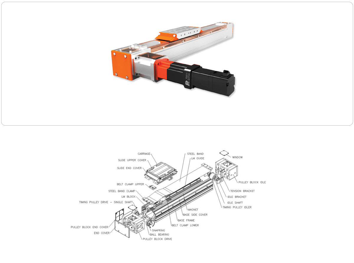 CLEAN TYPE 또는 DUST PROOF TYPE의 직교 로봇으로 STEEL BAND를 적용하여 구동시 LM GUIDE, BELT 및 PULLEY의