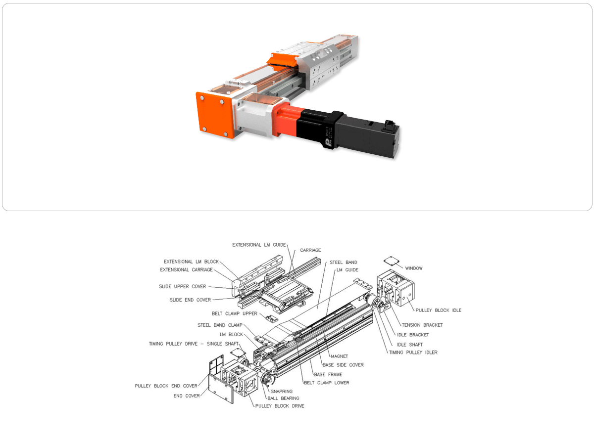 CLEAN TYPE 또는 DUST PROOF TYPE의 직교 로봇으로 STEEL BAND를 적용하여 구동시 LM GUIDE와 BALL SCREW의 마칠로 인해 발생되는 비산 먼지가 공기중에 유포 되지 않도록 ROBOT을 최대한 밀폐하게 만들어 청정도의 유지기 필요한 CLEAN ROOM에 적용하도록 제작된 제품으로 측면에 LM GUIDE와 확장형 SLIDE를 추가하여 허용 하중을 증가하기 위한 ROBOT