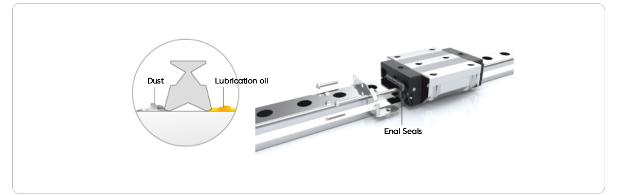 The block of all models are equipped with contact-type "end seals", "bottom seals" and "inner seals". It can effectively prevent foreign particals, dust and wood chips from invading the block, and reduce the overflow of lubricating oil in the block.