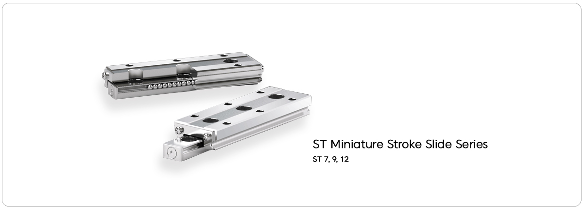 The ST Miniature Stroke Slide Series is designed with two rows of balls. The ball track has a gothic profile design with a 45 degree contact angle to achieve equal load capacity in a mono block. This provides more space for the larger rolling elements while enhancing the load and moment capacity.