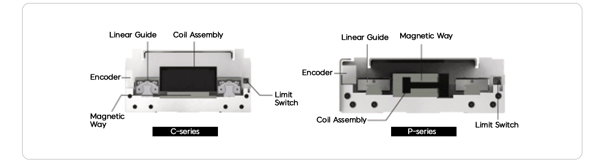 CLMS has optimized the allocated space for linear motor, linear guide, and optical (magnetic) encoder to minimize the size under thrust.