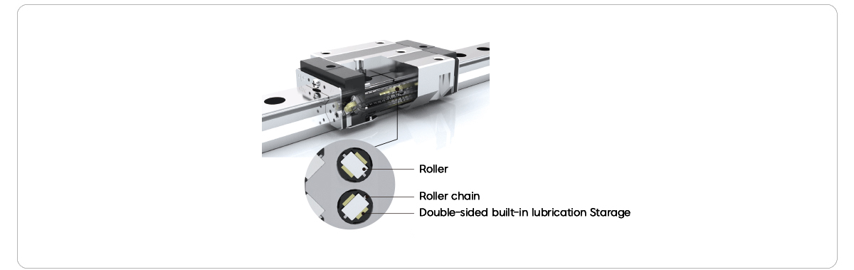 The built-in PU lubrication storage is embedded in the revolving channel at both ends and the inner pipe of the block, which does not increase the length of the block, but can directly contact the rollers in each row. And according to the operating environment, the block is immersed in the lubricant, and the lubricant can also